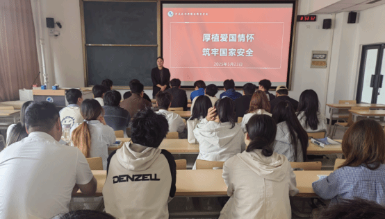 为深入学习贯彻习近平新时代中国特色社会主义思想,进一步增强青年学生的国家安全意识,厚植爱国情怀,筑牢思想防线,44118太阳成城集团教师支部书记郭雪白以“根植爱国情怀,筑牢国家安全”为主题为学生讲授专题党课。