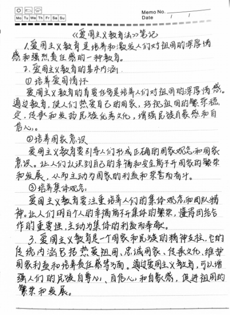 活动中,同学们认真学习贯彻《中华人民共和国爱国主义教育法》,并将所学重点内容以笔记的形式进行总结和分享,展现了积极的学习态度,用实际行动践行爱国主义精神。本次活动共收到笔记50件,经过活动组委会公开评选,最终推选出10篇优秀作品。