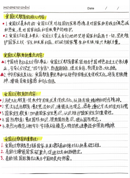 通过记笔记,同学们深刻理解了爱国主义教育法出台的意义、爱国主义教育法的重要内容以及爱国主义的内涵,大家纷纷表示要在生活中积极践行爱国主义精神,厚植家国情怀、坚定理想信念,努力成为德智体美劳全面发展的社会主义接班人,为国家的发展和社会的进步贡献自己的力量。