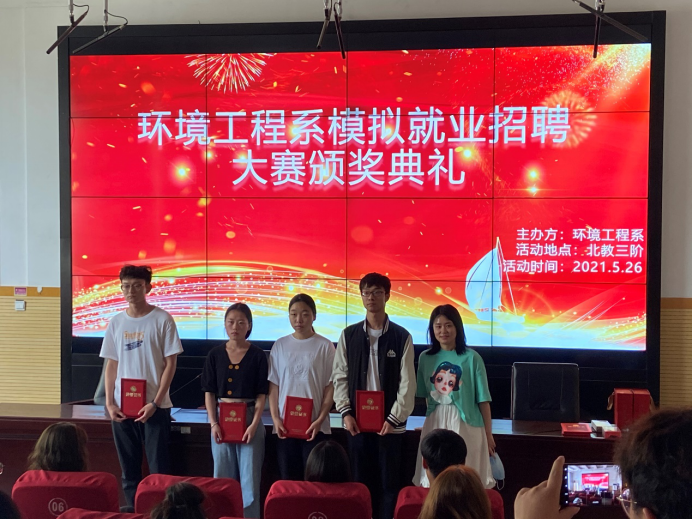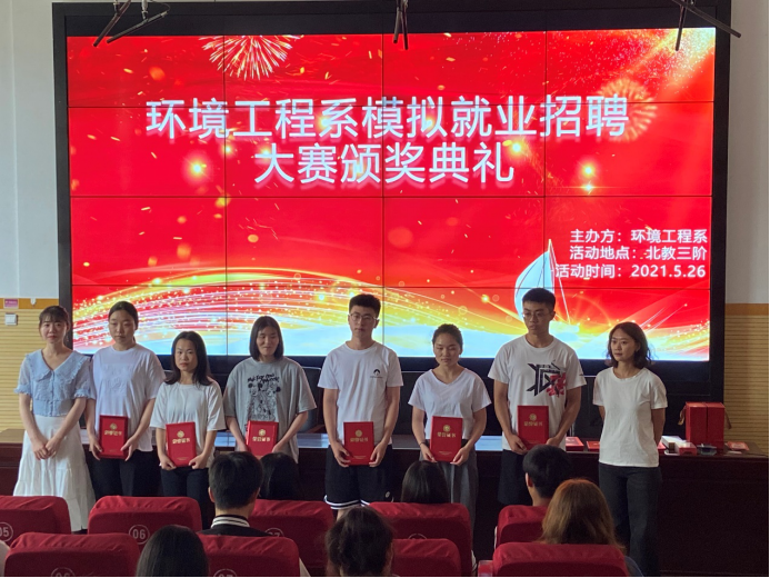 5月26日,环境工程系举行模拟就业招聘大赛颁奖典礼,系主任张剑以及指导老师董晓明、潘春梅、杨舒淇、王慧娟、张靖曼出席典礼。