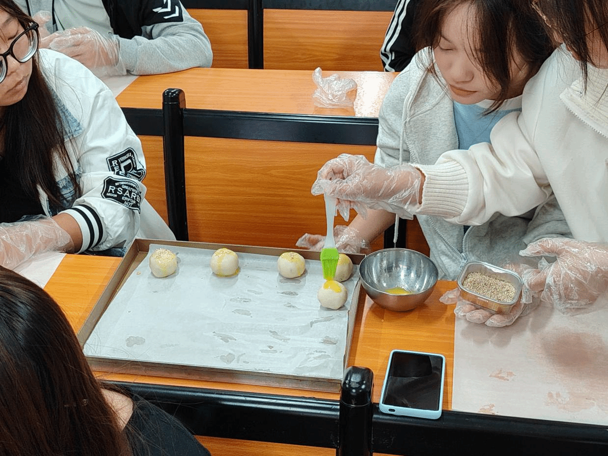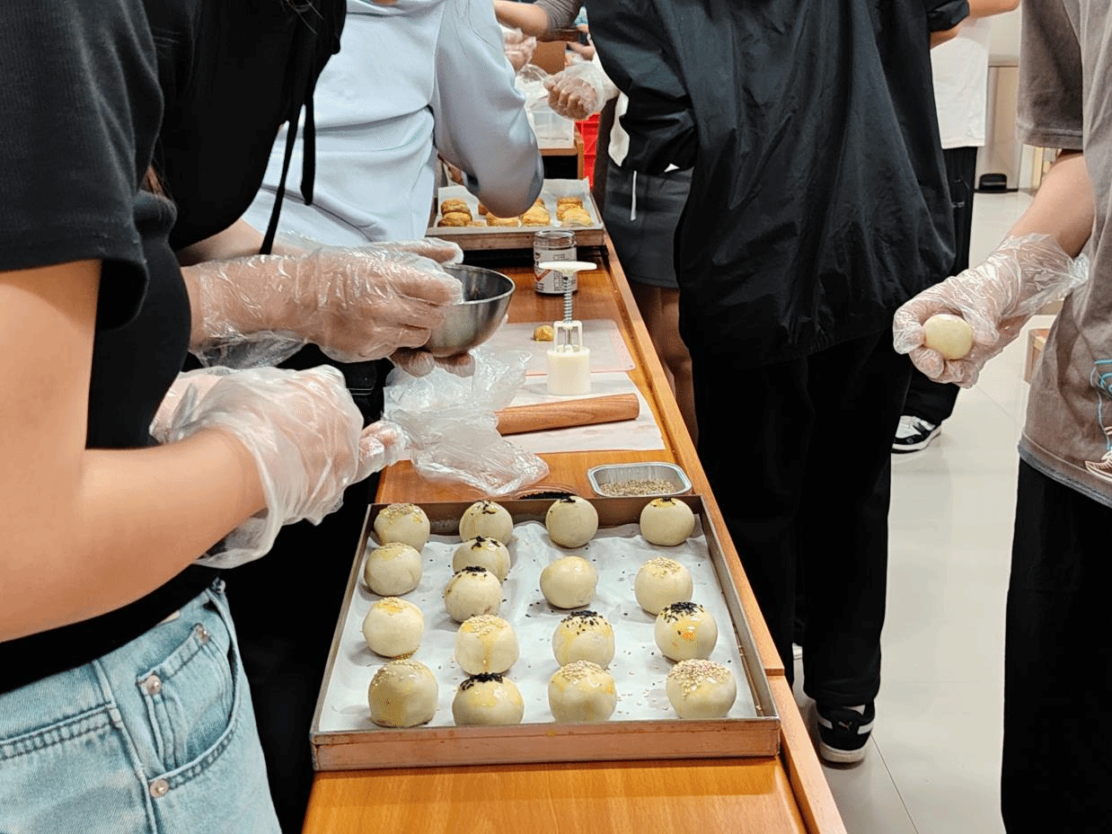 活动现场,同学们在面点师傅的耐心指导下,逐步掌握了月饼从和面、包馅到压模、烘焙的全流程。每一道工序都蕴藏着传统手工艺的智慧与匠心,大家在亲手实践中不仅学到了技能,更体会到中秋文化背后的深厚底蕴。活动过程中,同学们分组协作、积极交流,现场洋溢着温馨而热烈的节日氛围。