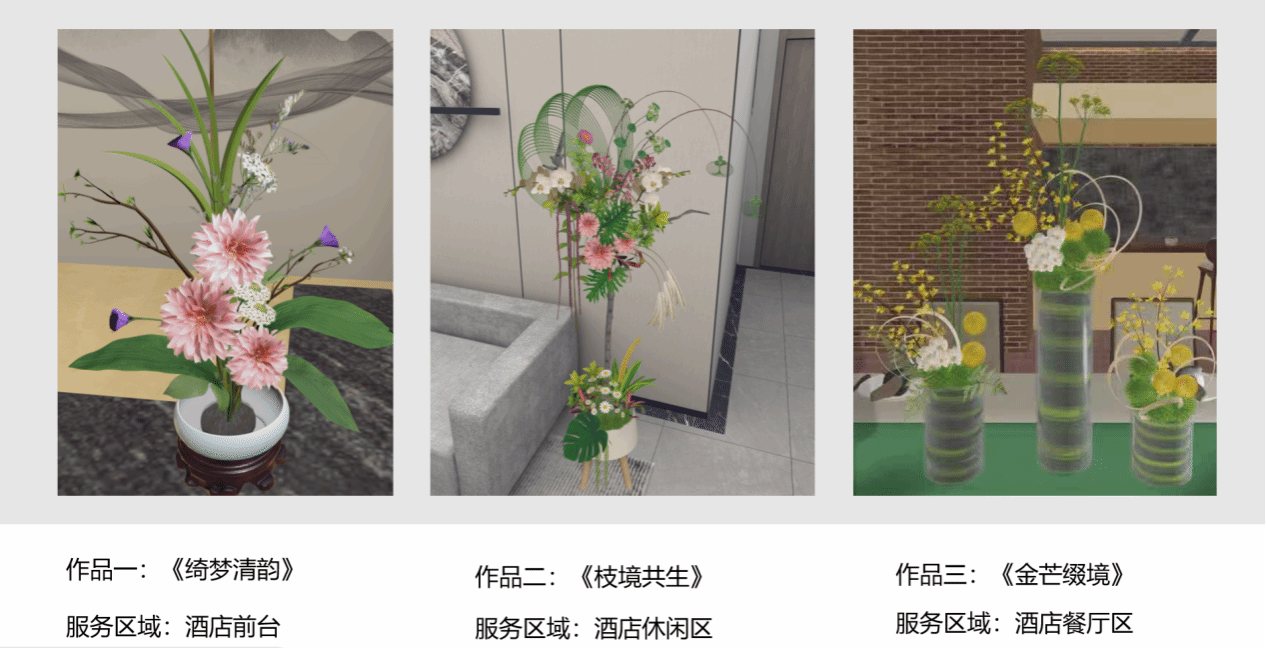 竞赛涵盖中国传统插花、现代花艺等创作内容。利用VR虚拟仿真技术展现花材、花器、场景等应用素材,从效果设计、花艺材料的裁切加工到作品场景效果图,覆盖花艺创作的全部环节。比赛参考世赛标准,全面考察参赛选手的花艺专业技能水平、创新能力、应用实践能力、职业素养及团队协作精神。
