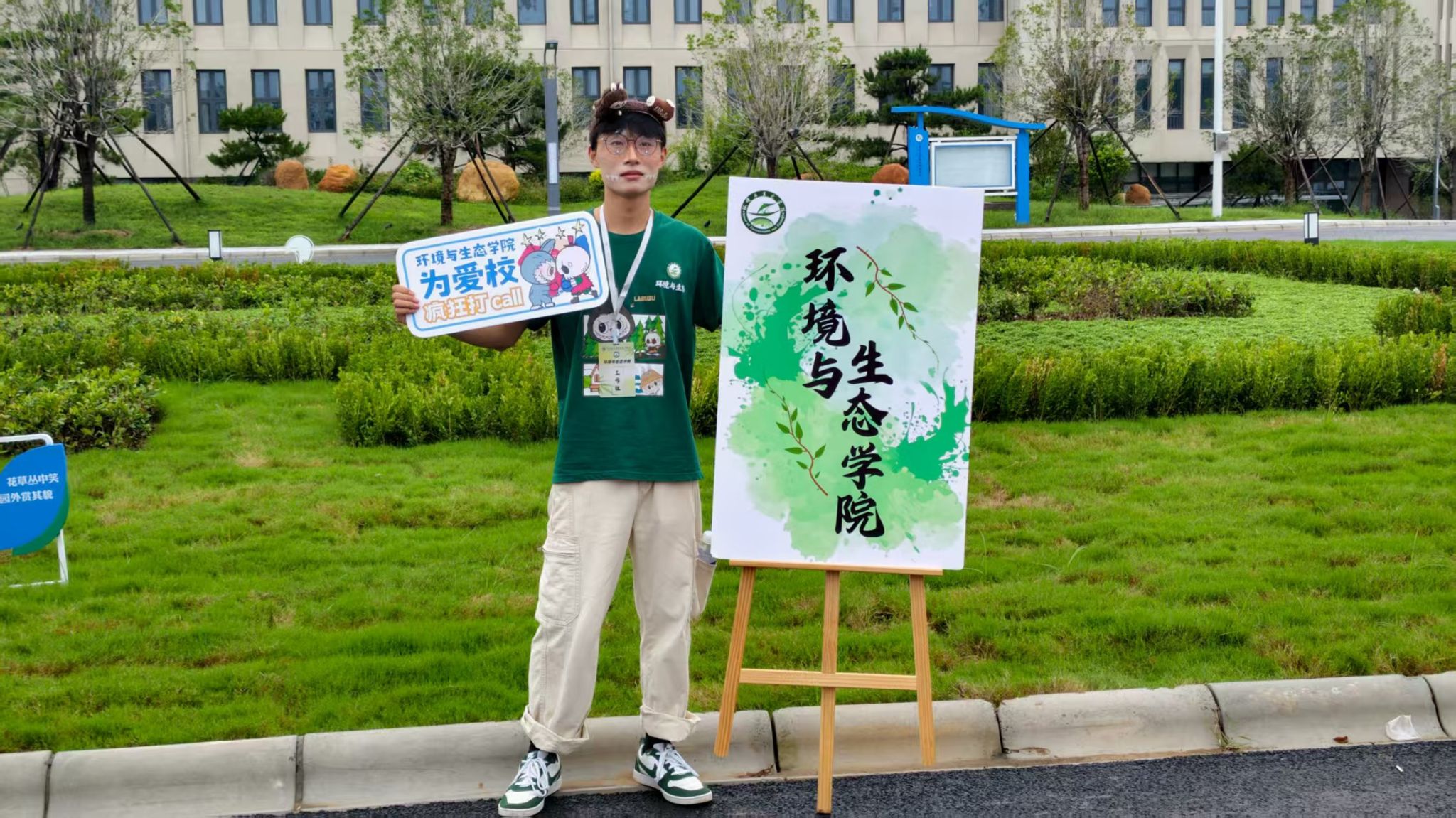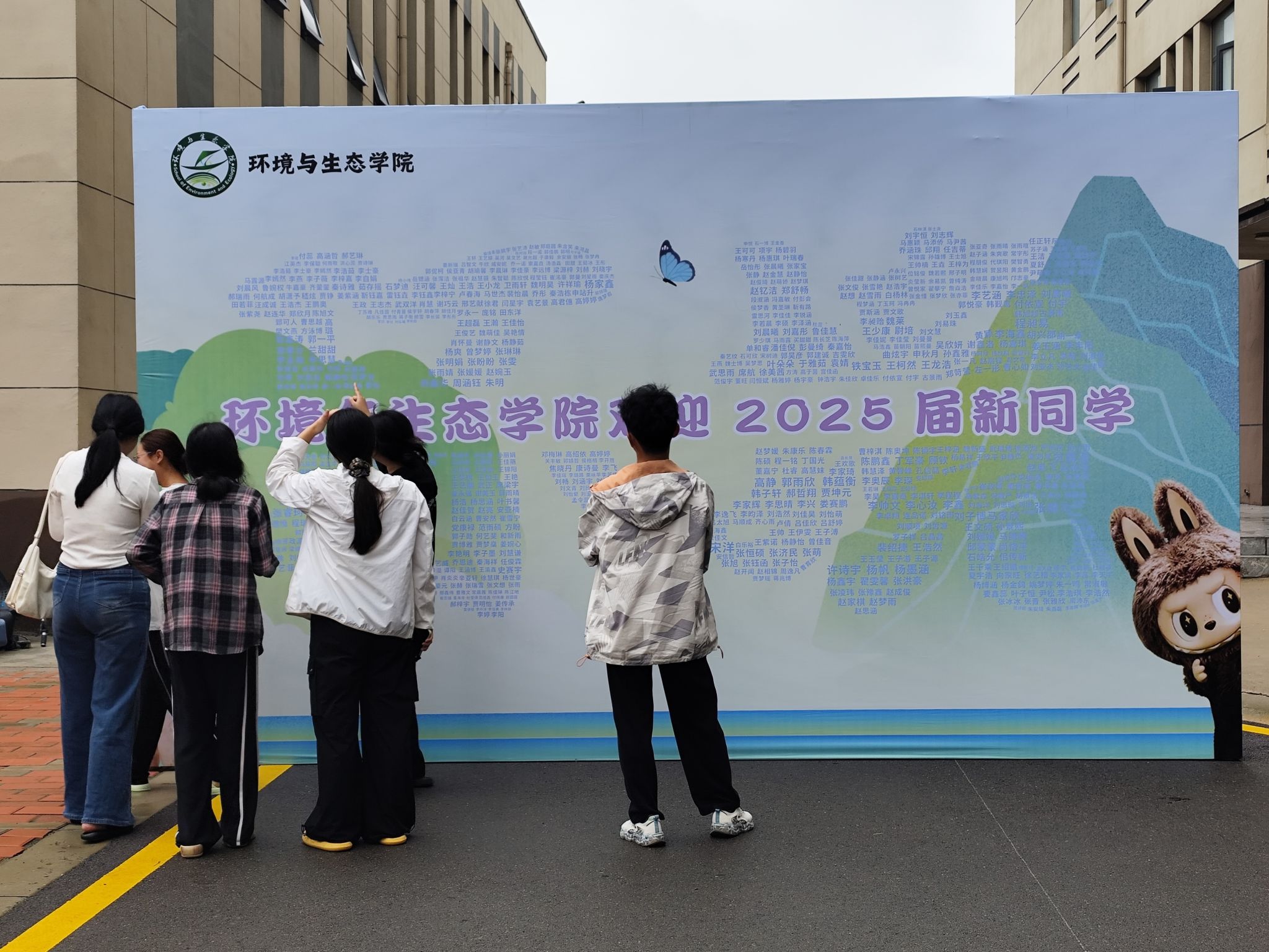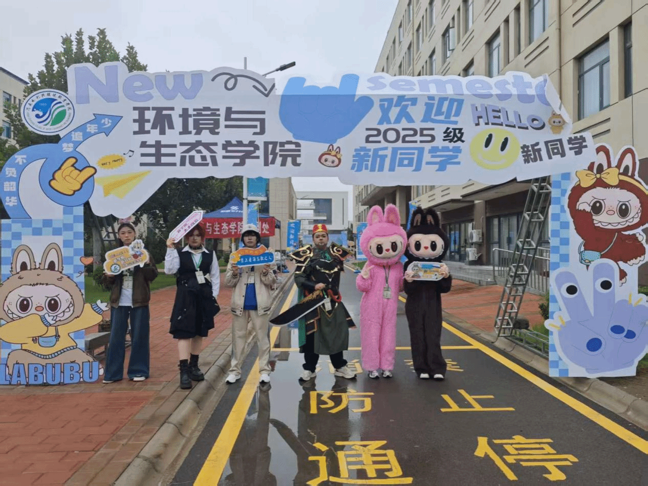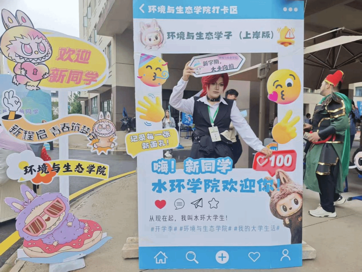 今年,学院将创新理念融入迎新实践,打造了一系列互动展品。其中,“新生合影墙”成为焦点,上面清晰地印着每一位新生的姓名。新生们纷纷在此驻足,兴奋地寻找自己的名字。此外,学院还定制了多种手持牌和合影框,如“你好,环境人er”、“执生态之笔,书青春华章”等标语,这些设计不仅提升了迎新的仪式感和互动性,更让新生在踏入校园的第一时间,就通过沉浸式体验直观感受到专业的特色与魅力,使报到成为一场生动而深刻的“专业初体验”。