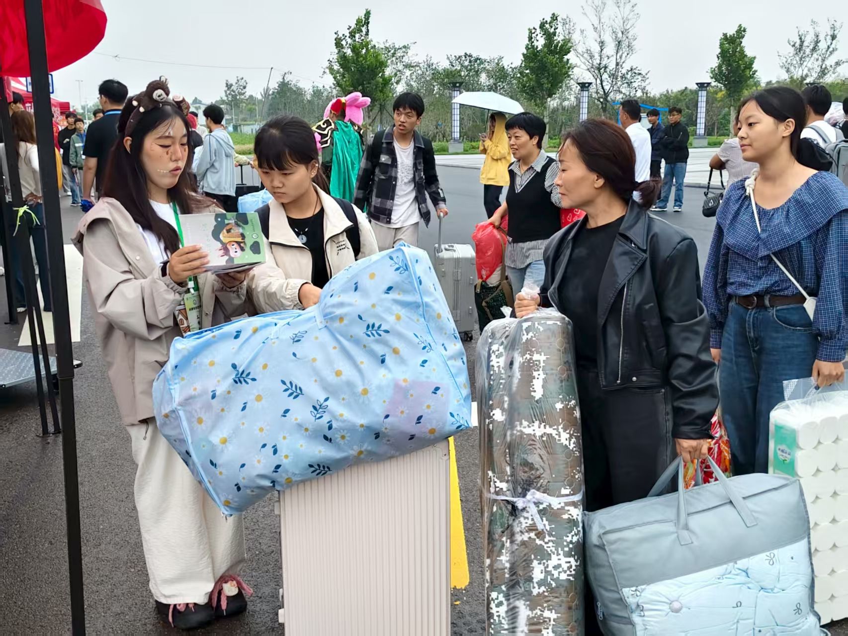 为确保迎新工作高效有序,学院提前筹备,组织学生志愿者统一着装,分工明确,在各服务点配备帐篷、桌椅、小推车、音响等物资,为新生及家长提供引导、咨询、搬运等服务。现场布置了注水旗、气球拱门、办事指南喷绘墙等,同时深受大家喜爱的玩偶拉布布也加入了迎新阵营,现场氛围浓烈,迎新志愿者热情高涨。