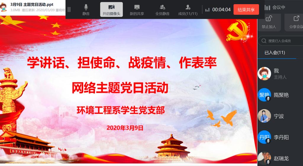 3月9日下午,环境工程系学生党支部采用钉钉直播形式组织开展“学讲话、担使命、战疫情、作表率”主题党日教育学习活动。活动由支部书记董晓明主持,学生党支部全体党员参加。