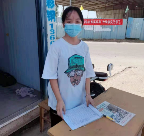 8月21日-8月23日,王宝睿在辉县市峪河镇毛庄村担任疫情防控志愿者,在村庄疫情防控卡点值班,对外来人员进行信息登记、扫码测温,并负责村庄的日常消毒工作。她说:“面对严峻的疫情形势,作为一名当代大学生,我有义务担当起疫情防控的责任,与家乡人民联合以来,勠力同心,抵御病魔。”