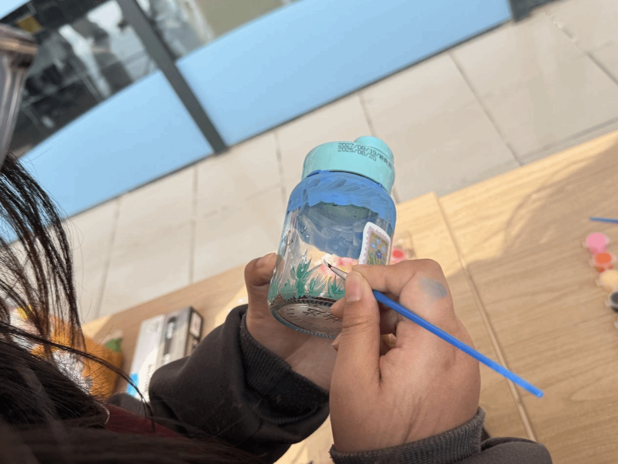 活动突破传统讲座模式,以“DIY+协作”为核心,鼓励学生自备废弃玻璃瓶、陶瓷罐等容器,两人一组合作创作。活动现场,颜料、麻绳、贴纸等材料一应俱全,闲置旧物在同学们的巧思下焕发新生——麻绳缠绕出质朴纹理,画笔勾勒出春日意象,贴纸拼贴出治愈图案。原本普通的瓶罐,成为承载绿意与心意的独特艺术品。